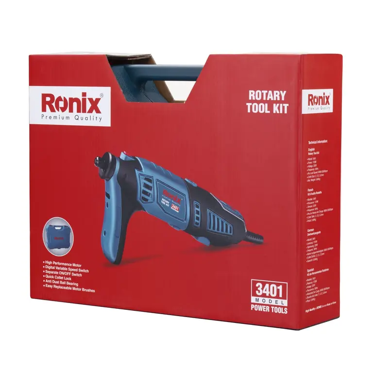 این محصول، یک فرز مینیاتوری به همراه مجموعهی کاملی از ابزار و وسایلی است که برای انجام کارهای مختلف، مورداستفاده قرار میگیرد. این دستگاه که با عنوان 3401 معرفیشده، توسط شرکت «رونیکس» (Ronix) تولید میشود. این دستگاه به یک موتور، با قدرت مناسب مجهز است که میتوان سرعت گردش آن را بهصورت دیجیتالی تنظیم کنید. 3 کولت برای کار در شرایط مختلف برای این محصول در نظر گرفتهشده است. علاوه بر این تعداد زیادی از انواع لوازم جانبی به همراه این ابزار عرضه میشود. فرز مینیاتوری مدل 3401 یک دستگاه چندکاره بهحساب میآید. از این دستگاه غالبا برای انجام کارهایی با دقت و ظرافت بالا استفاده میشود. ازجمله این موارد میتوان به برشهای دقیق فلزات و چوب، دادن طرحهای مختلف در چوب، انواع سوهانکاری و بسیاری موارد دیگر اشاره کرد. این محصول موتوری با قدرت 170 وات دارد. حداکثر سرعت گردش موتور به 35000 دوربردقیقه میرسد. سرعت گردش موتور دستگاه را میتوان به کمک بخش دیجیتالی انتهای دسته بین 8000 تا 35000 دوربردقیقه تنظیم کرد. با توجه به اینکه کاربرد این دستگاه در انجام کارهایی با ظرافت بالا است، میتوان با اتصال یکی از 3 گونهی کولت (سری دستگاه) به محصول، نیاز به در دست گرفتن دستگاه را برطرف کرد. در کنار این محصول 122 عدد لوازم جانبی هم وجود دارد. گونههای مختلف سنگ سنباده و برش، متههایی با قطر بسیار کم، صفحههای سنباده، دو نوع فرچه و انواع پایههای مخصوص دستگاه در بیت این 122 عدد لوازم جانبی دیده میشود. با استفاده از پایههای قرارگرفته در این مجموعه، میتوانید دستگاه را به چند حالت معلق، روی میز و عمودی استفاده کرد. در شغلهای مختلفی از فرزهای مینیاتوری استفاده میکنند. ازجملهی این مشاغل که در آن از این نوع فرز استفادهی بسیار زیادی میکنند، تولیدکنندگان دکورهای چوبی و فلزی هستند. شرکت رونیکس هم نمونههایی از این دستگاه را تولید کرده است. شاید کیفیت ساخت محصولات رونیکس، در حد برندهای خارجی نظیر بوش نباشد، اما با در نظر گرفتن قیمت و سطح کیفی مدل 3401، تهیهی این محصول مقرونبهصرفه به نظر میرسد. 3401 یکی از فرزهای مینیاتوری ساخت شرکت رونیکس است که با یک موتور 170 واتی کار میکند. 129 عدد انواع کولت، پایه و لوازم جانبی دیگر در کیف پلاستیکیای محصول قرارگرفته است.